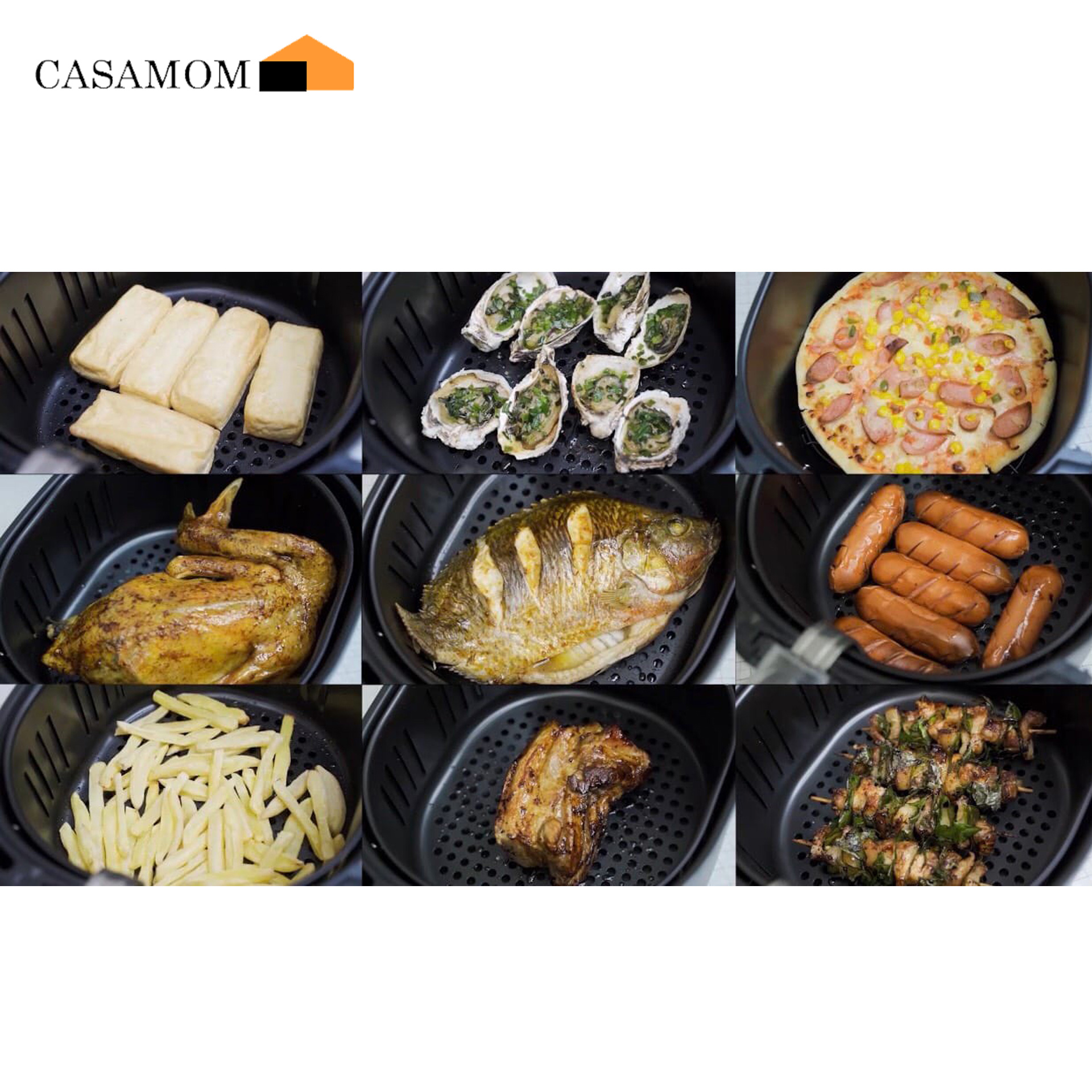 Nồi chiên không dầu Casamom CAA-201 với dung tích 7 lít, bạn có thể chế biến các món như: Cánh gà/ đùi gà chiên, khoai tây/ khoai lang chiên, chiên xôi, chiên bánh, chiên nem, chiên cá… hoặc chiên nguyên cả con gà.