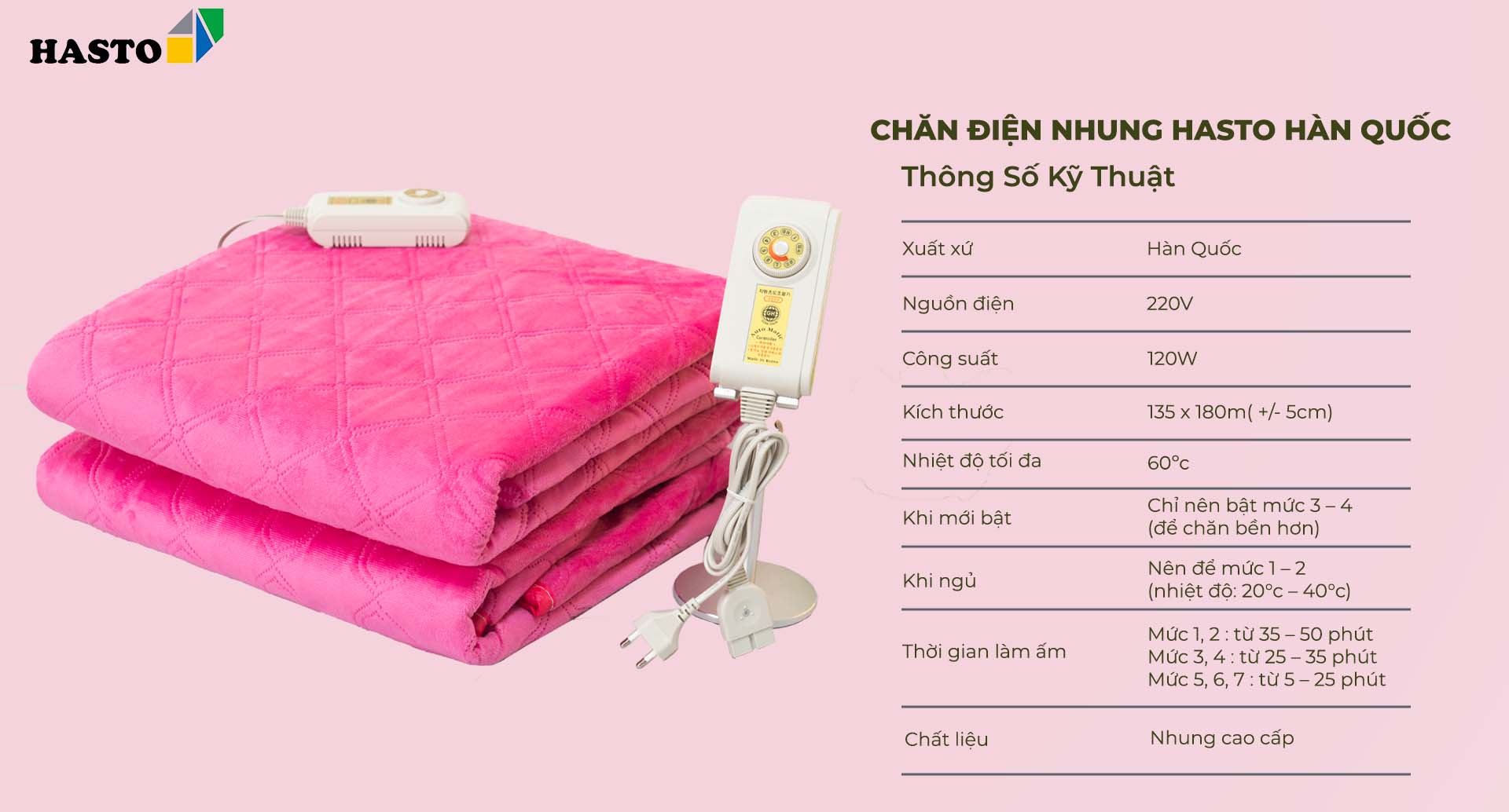 Chăn điện nhung Hasto là sản phẩm chăn điện cao cấp được nhập khẩu trực tiếp từ Hàn Quốc được làm bằng nhung sưởi ấm nhanh, độ bền cao, giữ ấm tốt và tạo cảm giác êm mềm thoải mái khi sử dụng.