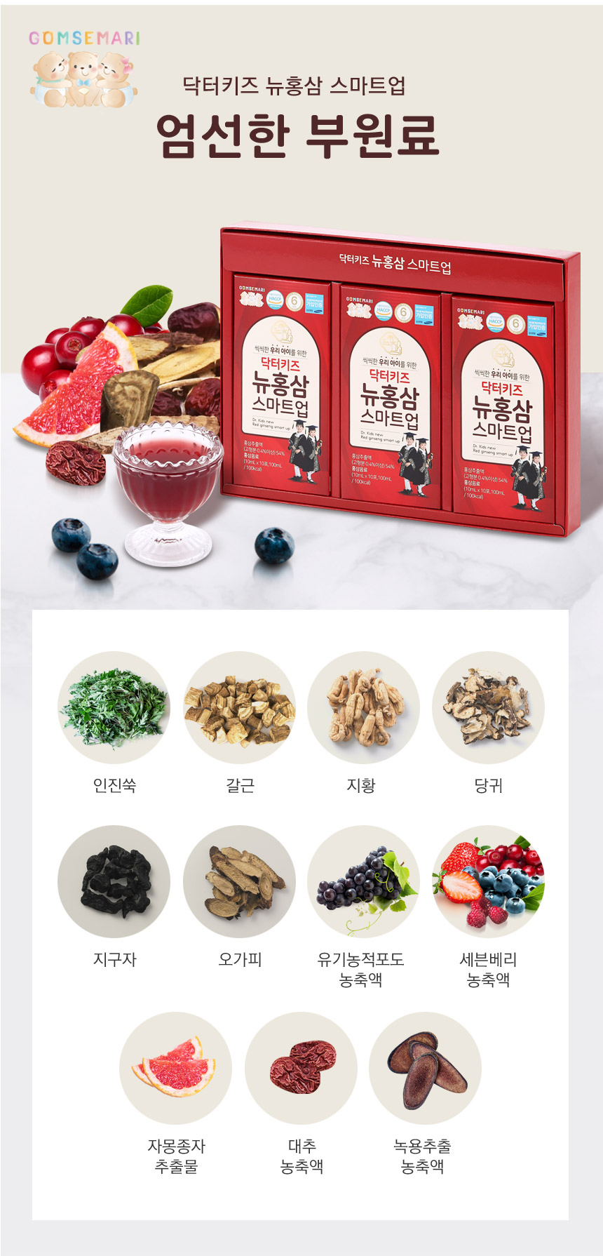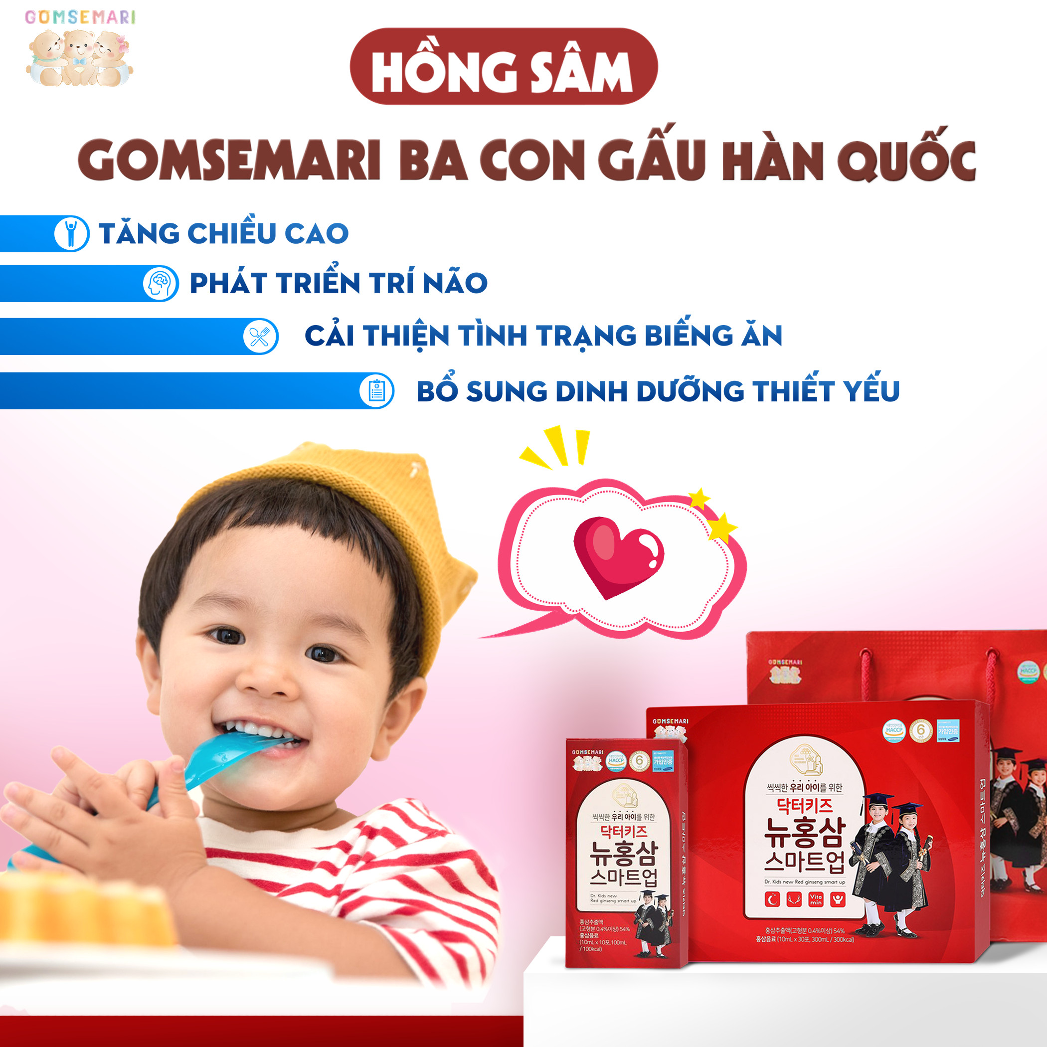 Hồng sâm trẻ em Gomsemari Ba Con Gấu Hàn Quốc 30 gói cho bé - Cải thiện chứng biếng ăn, tăng cường đề kháng. Sản phẩm được bảo hộ bởi SamSung Hàn Quốc, được chứng nhận quản lý an toàn thực phẩm HACCP của Bộ an toàn thực dược phẩm