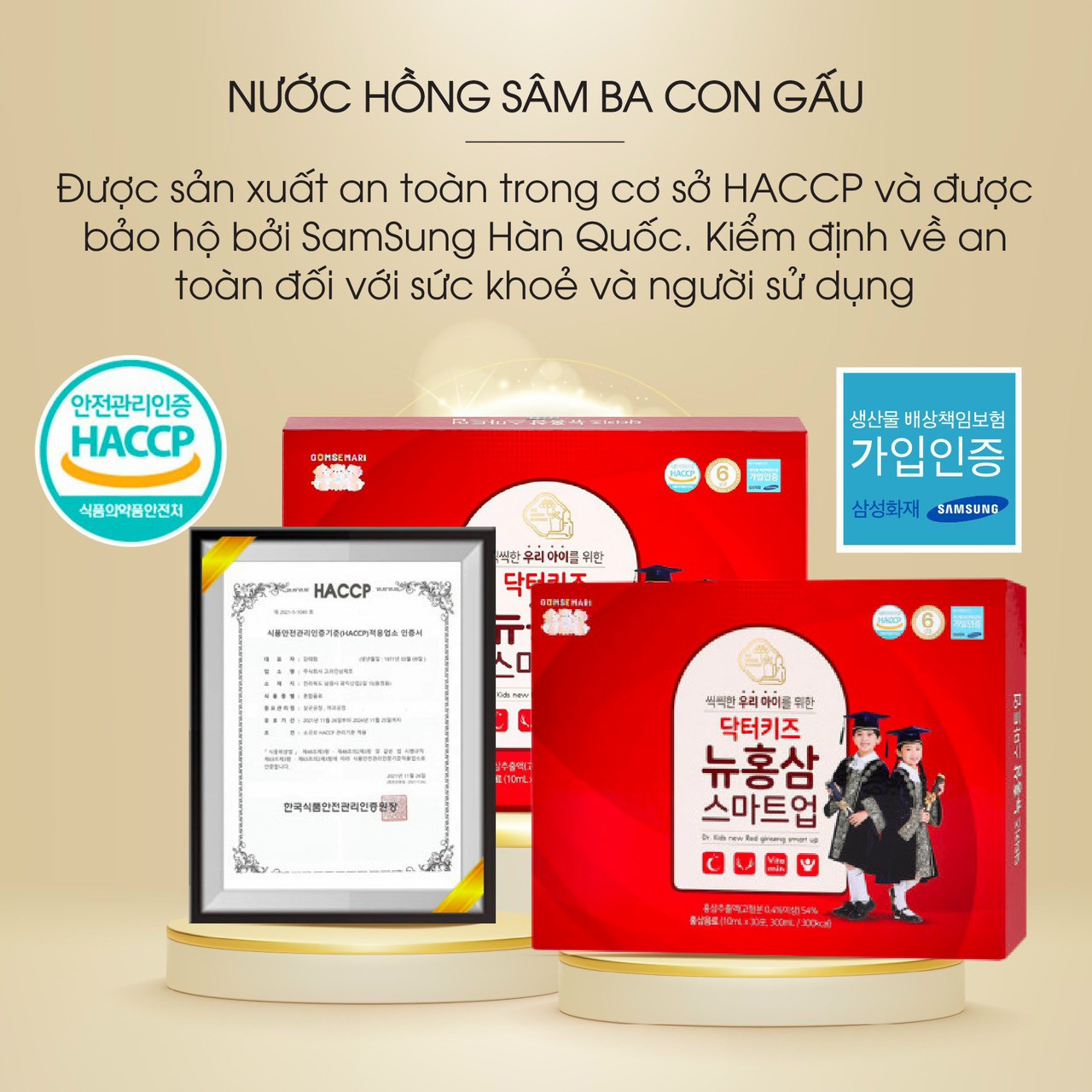 Lưu ý: Thành phần trong sản phẩm nước Hồng Sâm Gomsemari Ba con Gấu đã được nghiên cứu kỹ lưỡng, không chứa chất gây hại cho sức khỏe, đảm bảo an toàn cho người sử dụng. Sản phẩm được cấp chứng nhận quản lý an toàn thực phẩm HACCP của Bộ an toàn thực dược phẩm và được bảo hộ bởi tập đoàn Samsung Hàn Quốc.