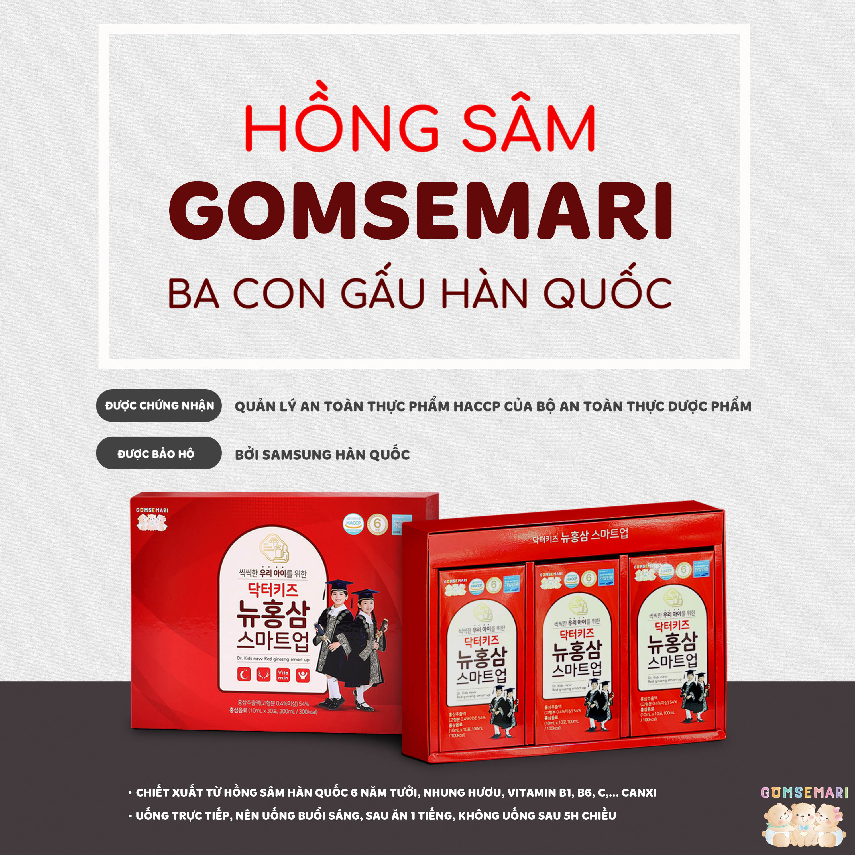 - Nước hồng sâm trẻ em Ba Con Gấu Hàn Quốc, là giải pháp tối ưu hỗ trợ cho trẻ tăng sức đề kháng, giúp ăn ngon ngủ sâu, phát triển trí não. Nước hồng sâm Gomsemari Ba Con Gấu Hàn Quốc là dạng gói , nước uống, có vị ngọt thanh, hương sâm thơm nồng dễ chịu, hỗ trợ lưu thông máu, tinh thần sảng khoái, vui tươi.