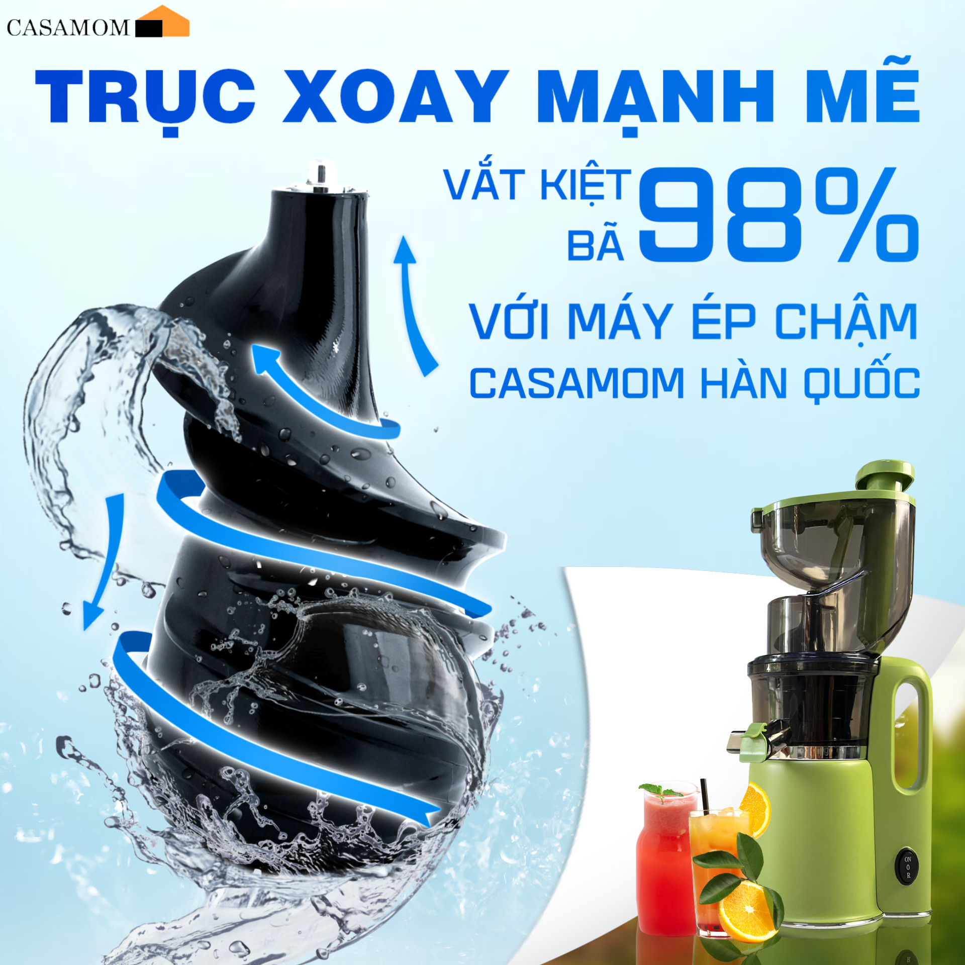 Đây là sản phẩm có nhiều ưu điểm nổi trội, và có giá vừa phải. Phù hợp với túi tiền của phần lớn mọi người. Máy ép chậm Casamom Hàn Quốc áp dụng công nghệ ép chậm thông minh, giữ nguyên cấu trúc vitamin, dưỡng chất có trong rau, củ, quả. Máy ép kiệt tới 97% cho lượng nước ép dồi dào hơn ép ly tâm truyền thống, đồng thời nước ép có vị tươi, ngon, giữ được màu sắc tự nhiên của rau quả, hạn chế tách lớp khi bảo quản.