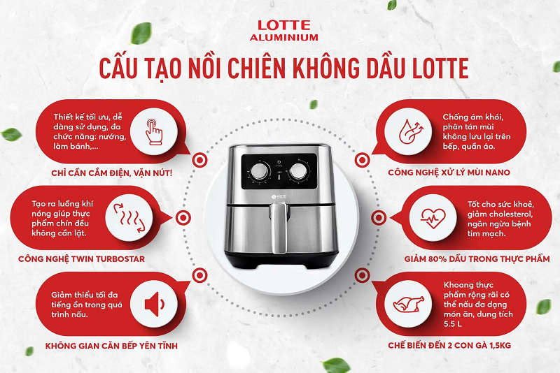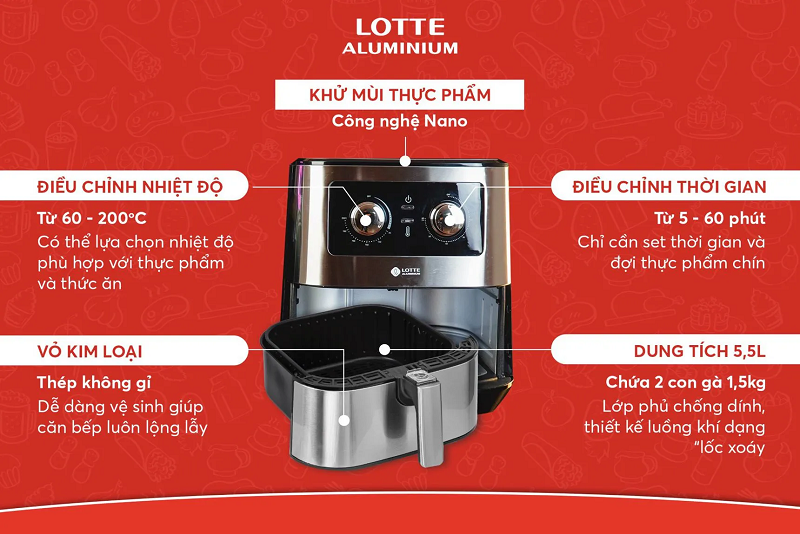- Nồi chiên không dầu Lotte LTS - AF5SM Hàn Quốc với dung tích 5.5 lít, bạn có thể chế biến các món như: Cánh gà/ đùi gà chiên, khoai tây/ khoai lang chiên, chiên xôi, chiên bánh, chiên nem, chiên cá…