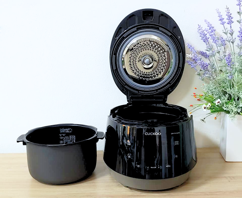 Các tính năng tiện dụng khác của Nồi cơm điện cao tần Cuckoo CRP-PW1085FD: Làm sạch bằng hơi nước tiệt trùng tự động, thoát nước để ngăn giữ nước gạo, Thiết bị an toàn và có hướng dẫn bằng giọng nói.