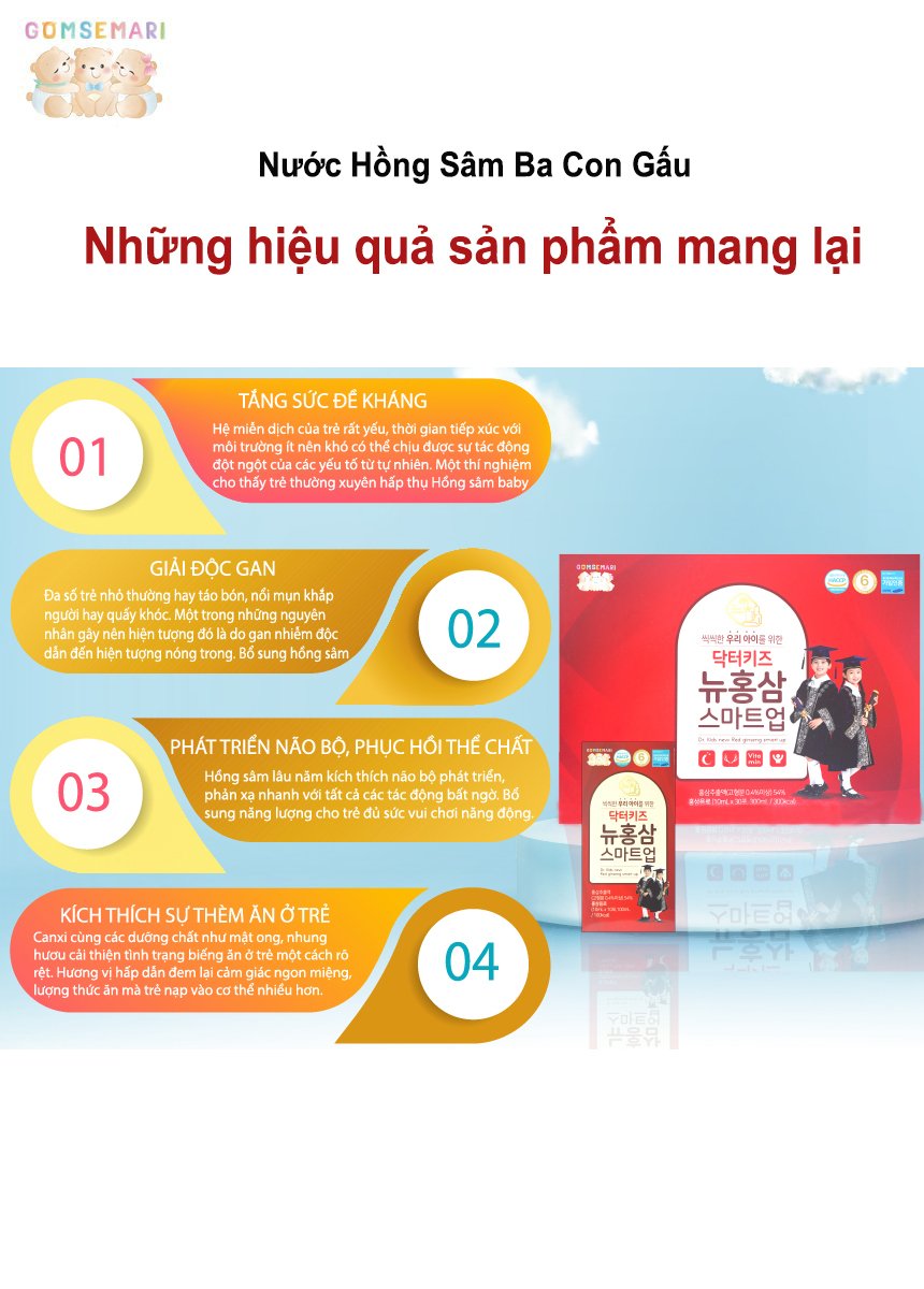 Nước hồng sâm Ba Con Gấu Hàn Quốc giúp phát triển trí tuệ cho trẻ. Sản phẩm được bảo hộ bởi SamSung Hàn Quốc.
