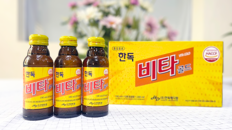 Nước uống bổ sung vitamin Hàn Quốc - Handok Vita Gold với thành phần là các vitamin như: vitamin C, vitamin nhóm B (B1, B2, B6) cùng các khoáng chất giúp tăng cường sức đề kháng, giảm mệt mỏi, tăng cường năng lượng và bảo vệ sức khỏe hiệu quả.