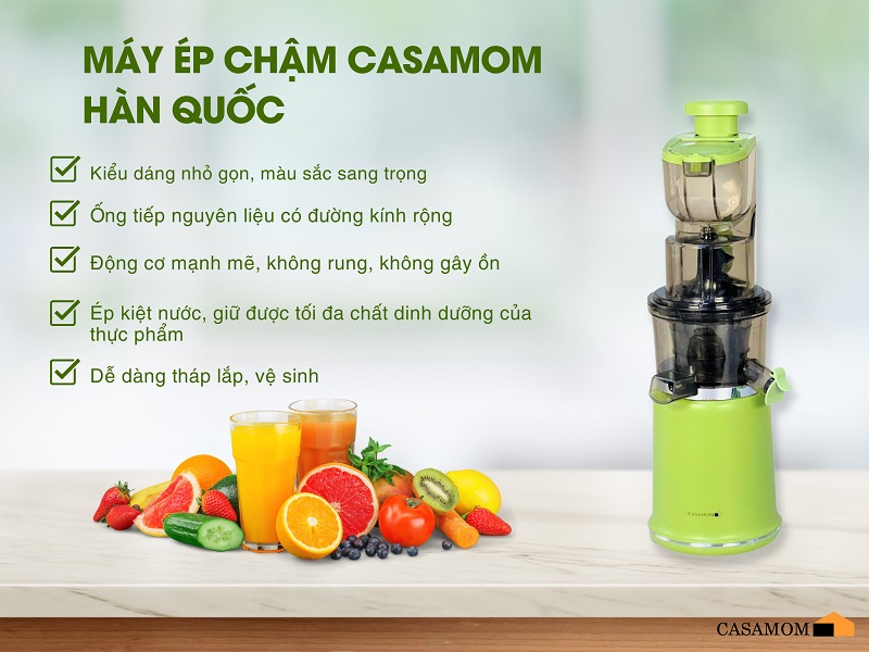 Với thiết kế nhỏ gọn, sang trọng, động cơ ép chậm khỏe, có thể ép được nhiều loại rau củ và trái cây tạo ra thành phẩm thơm ngon và giàu dưỡng chất giúp cho máy ép chậm Casamom Hàn Quốc trở thành sản phẩm gia dụng không nên thiếu trong mỗi gia đình.