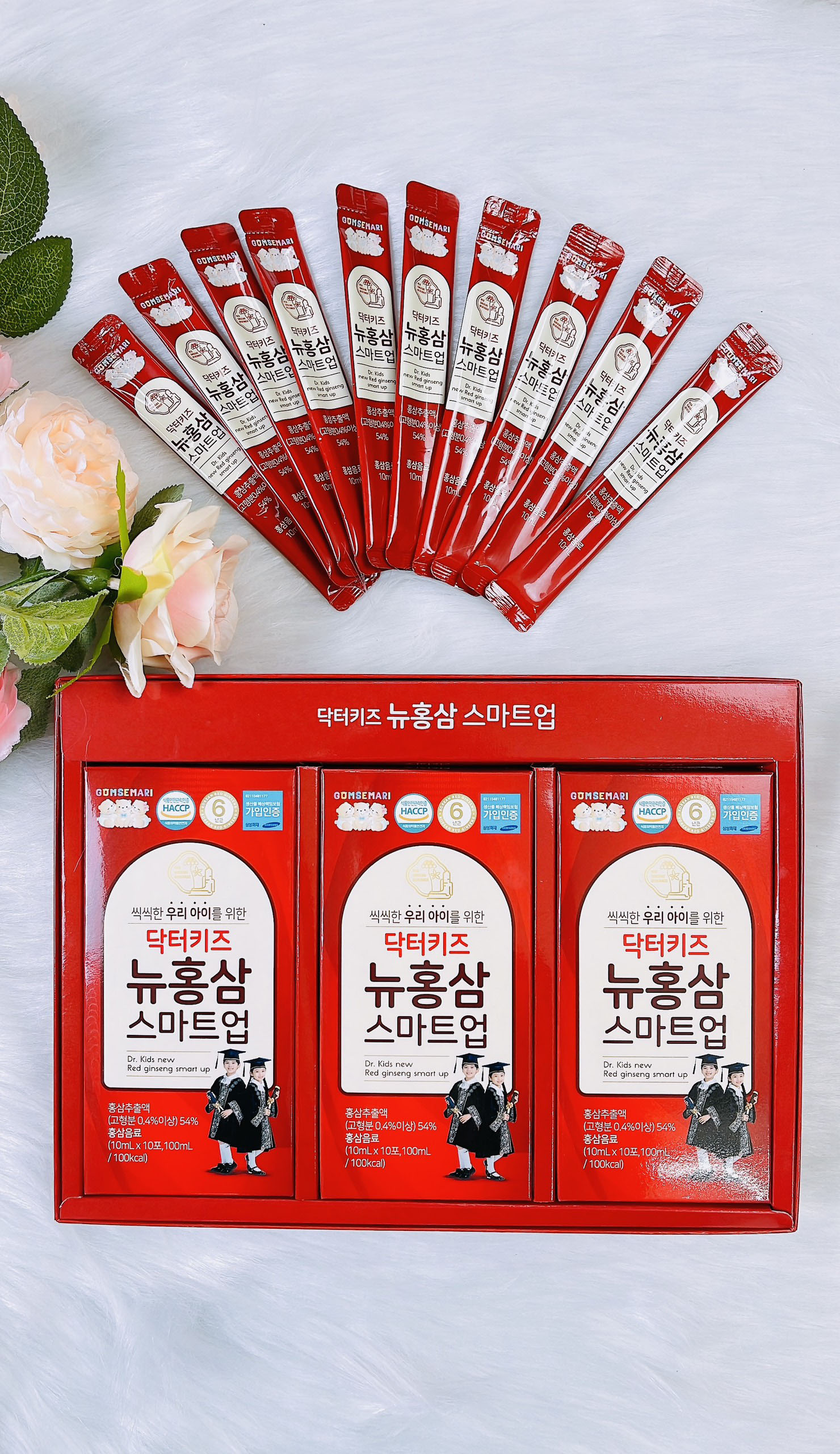 Nước hồng sâm trẻ em Ba Con Gấu Gomsemari dạng từng gói nhỏ thật tiện lợi và dễ uống, bé uống bổ sung mỗi ngày.