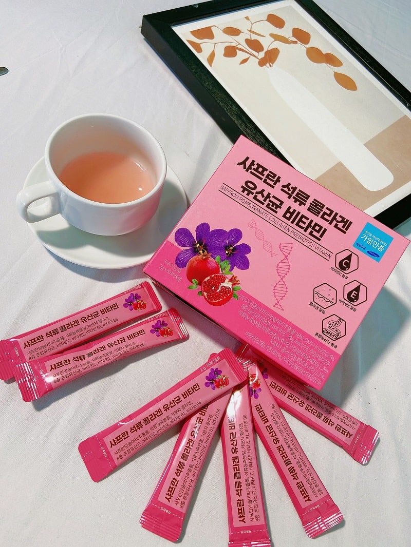 Collagen lựu hoa nghệ tây saffron Hàn Quốc với thành phần chủ yếu là collagen, chiết xuất lựu đỏ cô đặc và nhụy hoa nghệ tây saffron. Ngoài ra, thành phần vitamin C, E, lợi khuẩn lactobacillus thực vật cũng giúp nâng cao hiệu quả đối với sức khỏe và làn da